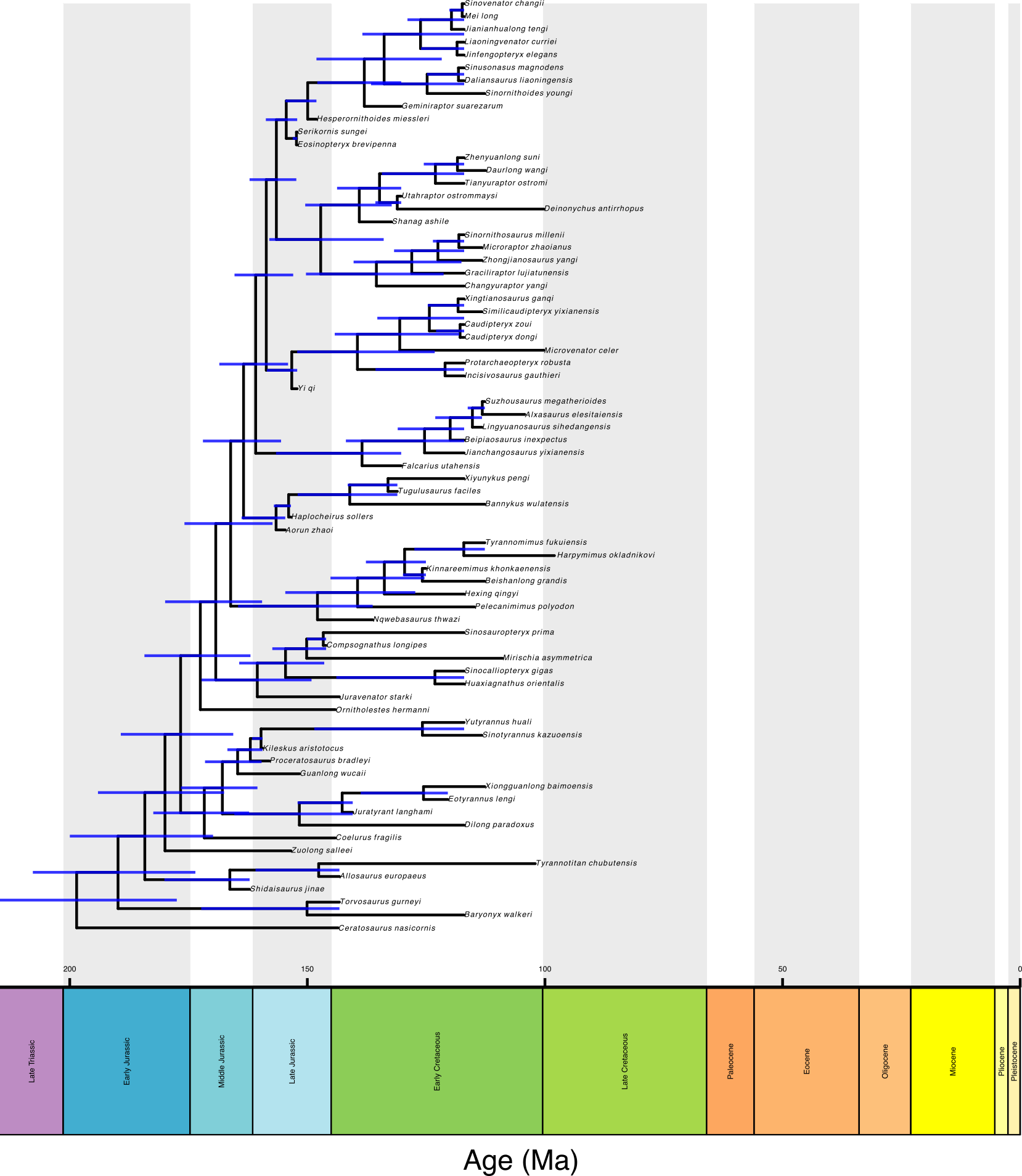 In paleobiology there are often situations where we want to date a supertree, or any tree for which we do not have any character data associated with taxa at the tips. This is commonly carried out in MrBayes, though it is also possible to do in RevBayes.The following tutorial provides sample code for dating a super tree of Theropod dinosaurs in Revbayes using the Fossilized Birth death model. The data is from Tasimov et al. (in prep) and is of 66 taxa with ages ranging from Middle Jurassic to Late Cretaceous.