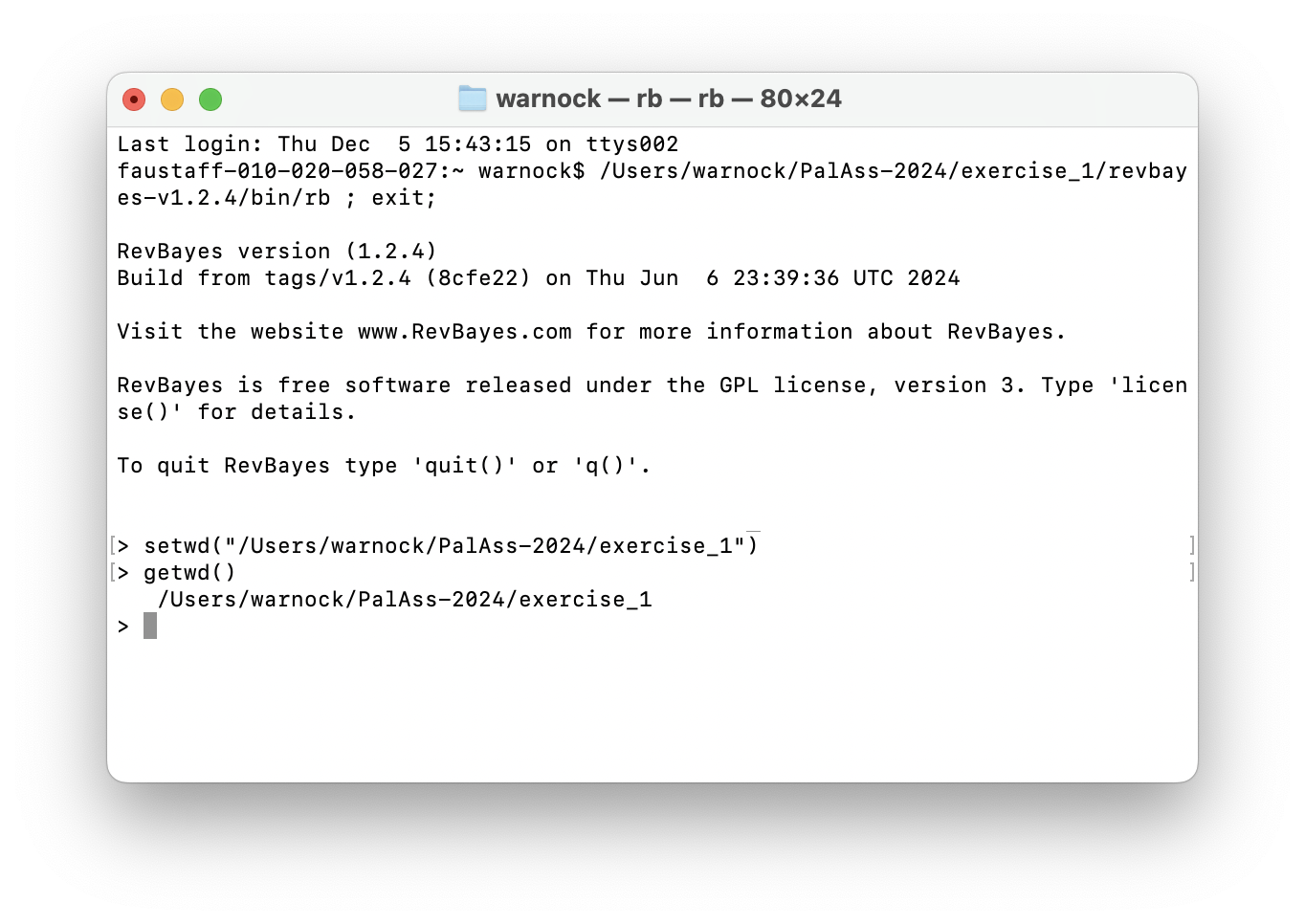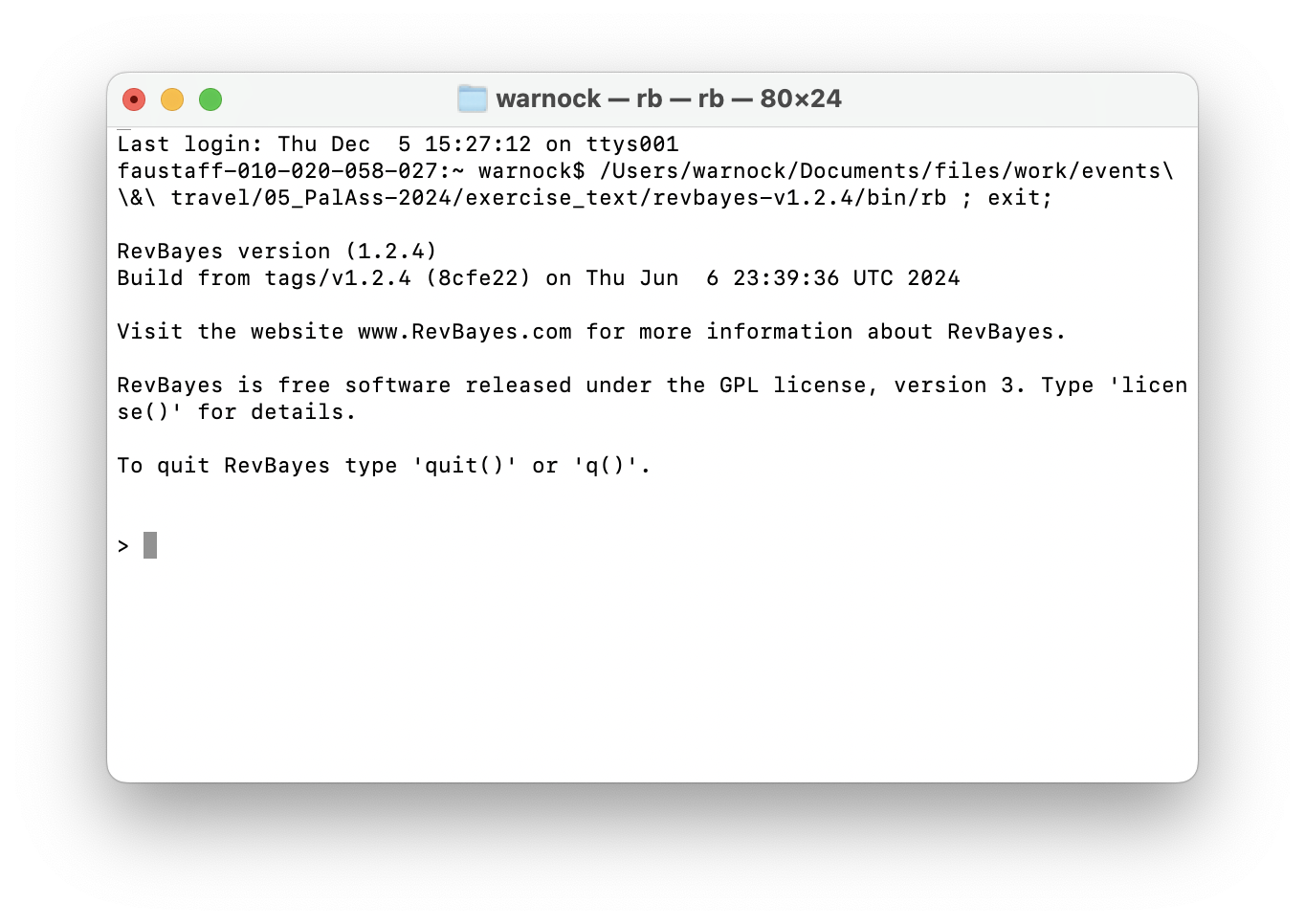 The current best way to run RevBayes on your computer is to edit your scripts using a source code editor, save these somewhere on your computer, along with your data, and call the Rev scripts from the RevBayes terminal.