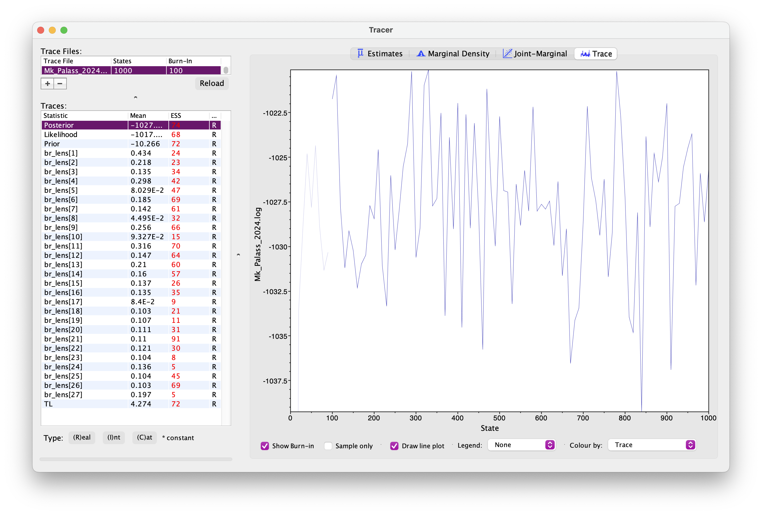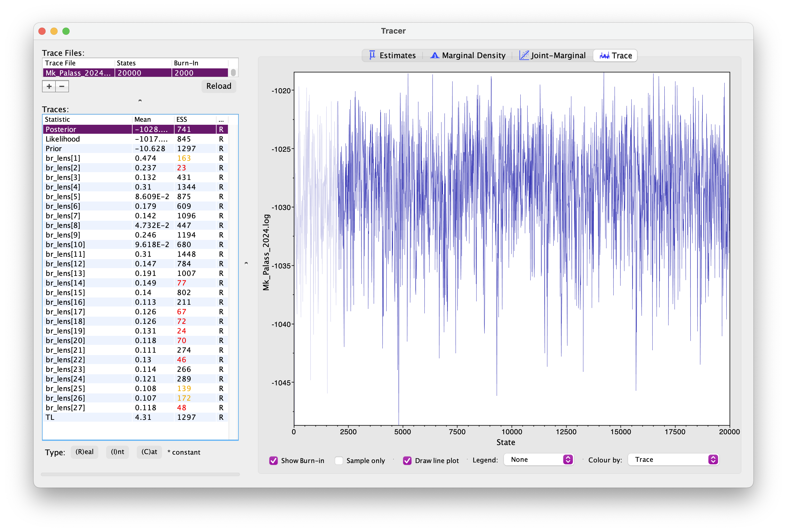 treetrace = readTreeTrace("output/Mk_Palass_2024.trees", treetype = "non-clock")